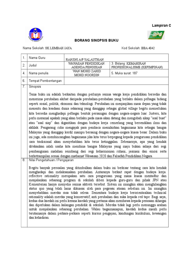 Doc lampiran c contoh borang sinopsis buku nurul aida academia edu. Razak 10 februari 2020 201 pg. Penulisan dalam buku ini terbukti suatu penulisan yang bertepatan dengan senario pada masa sekarang.