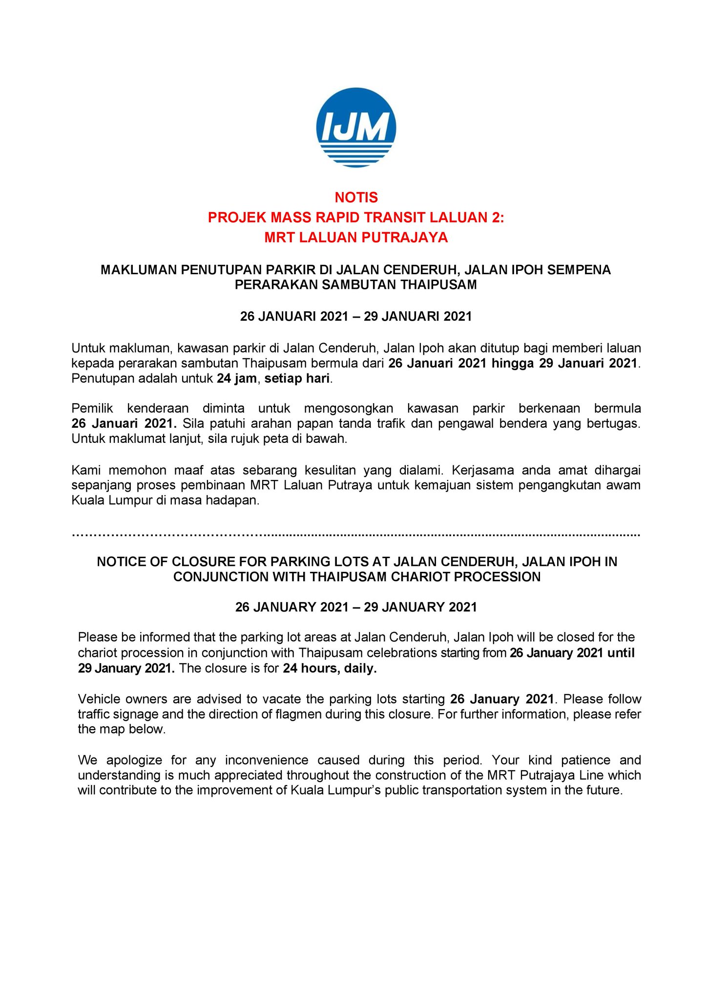 Mrt Corp On Twitter Notice Of Closure For Parking Lots At Jalan Cenderuh Jalan Ipoh In Conjunction With Thaipusam Chariot Procession 26 January 2021 29 January 2021 Kltu Https T Co Gguqibwe4o Twitter